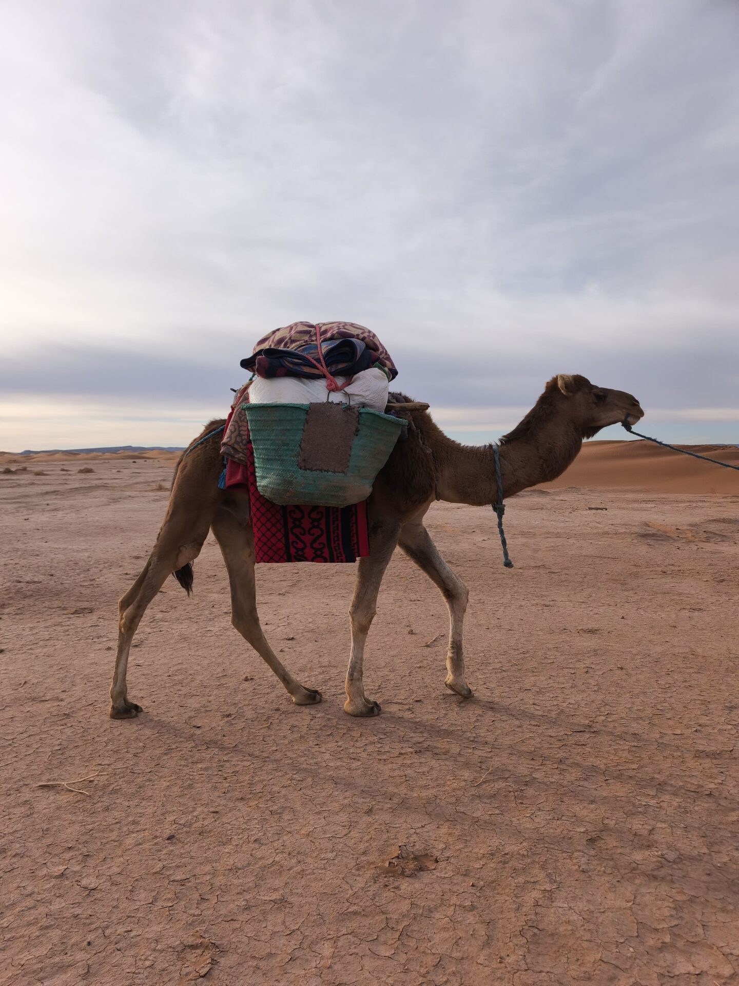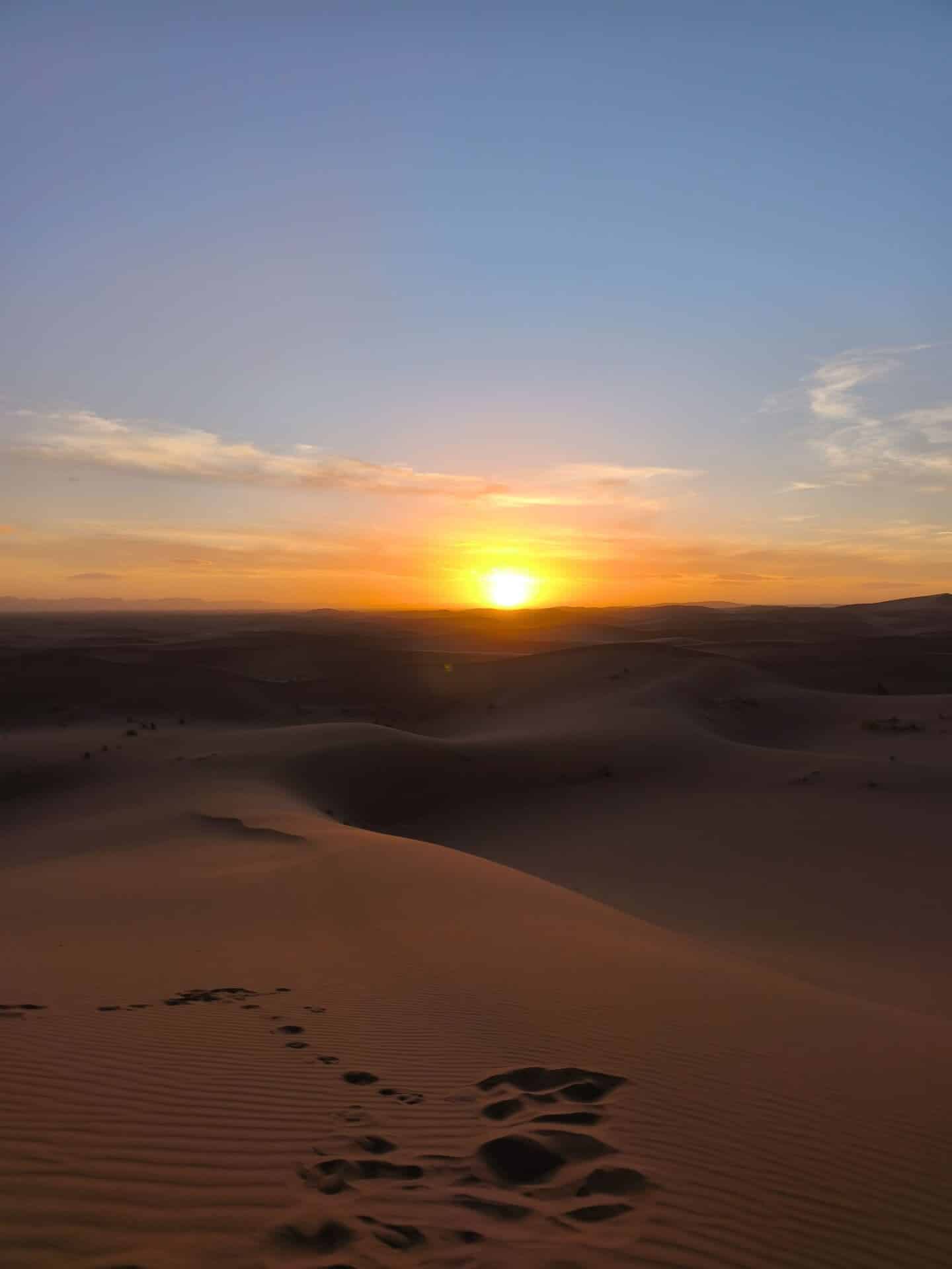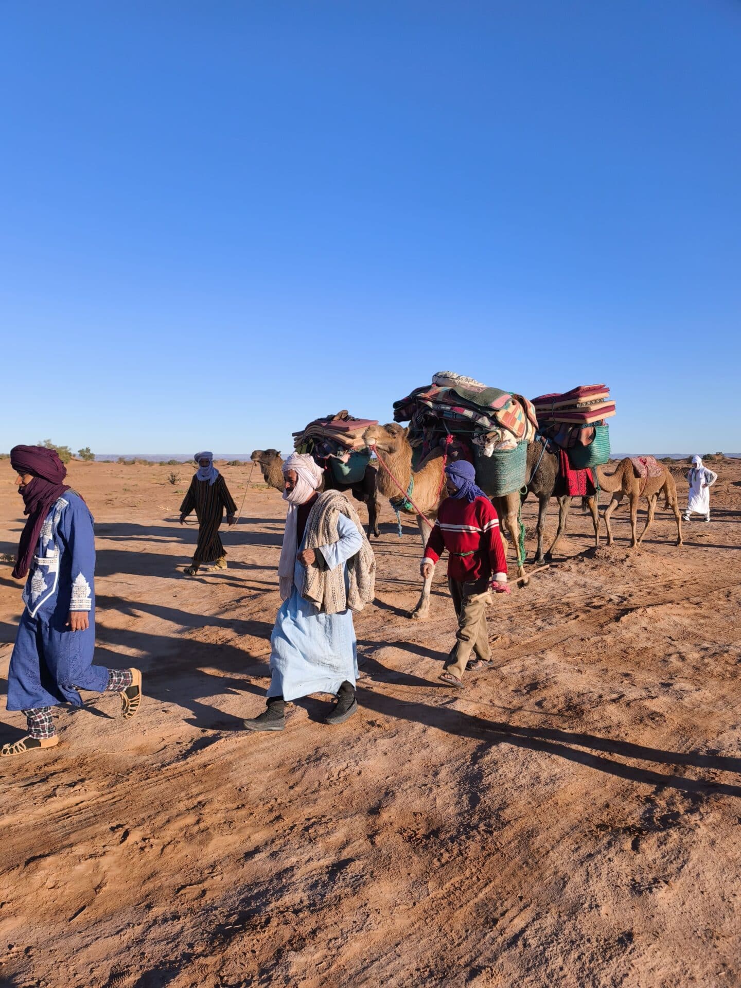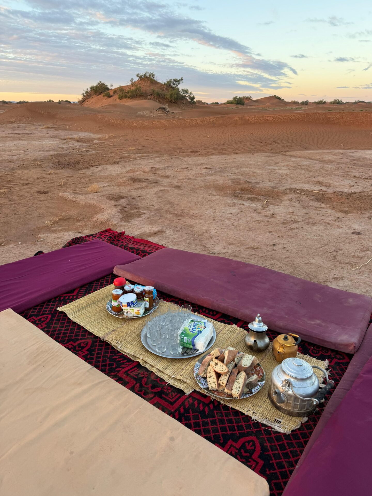 Chaque matin, le petit-déjeuner était servi aux alentours de 8h, toujours en haut d’une dune. Installés sur des tapis, nous partagions du pain des sables préparé la veille, accompagné de thé marocain encore chaud. Une fois le camp levé et les dromadaires chargés, nous partions pour plusieurs heures de marche à la découverte du désert. En moyenne, nous faisions 15km par jour.