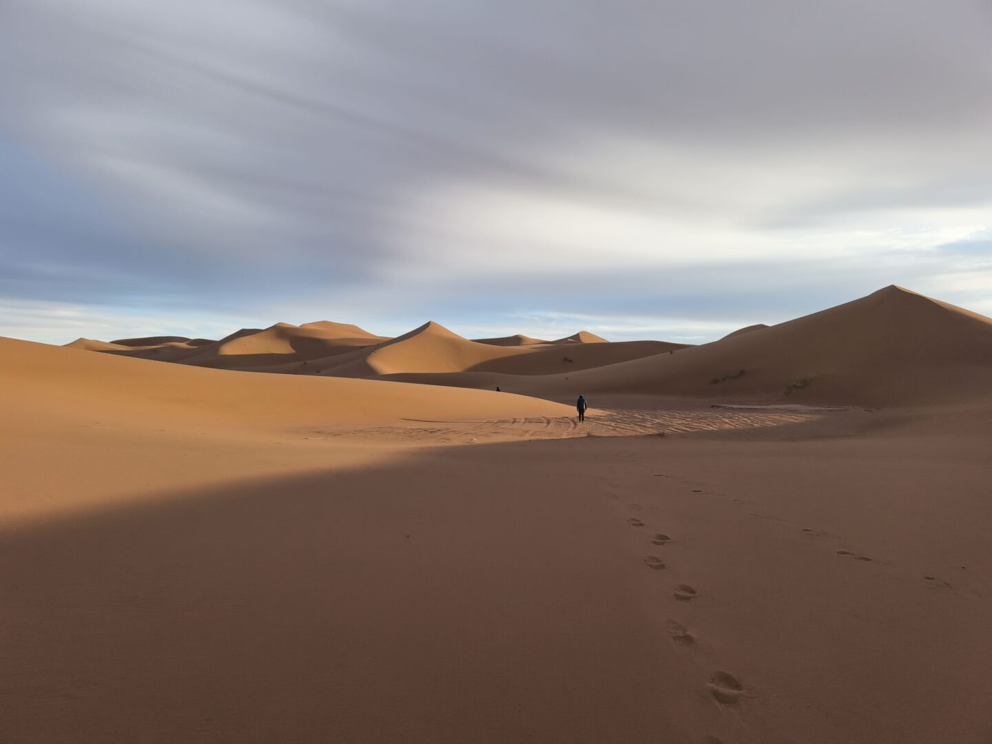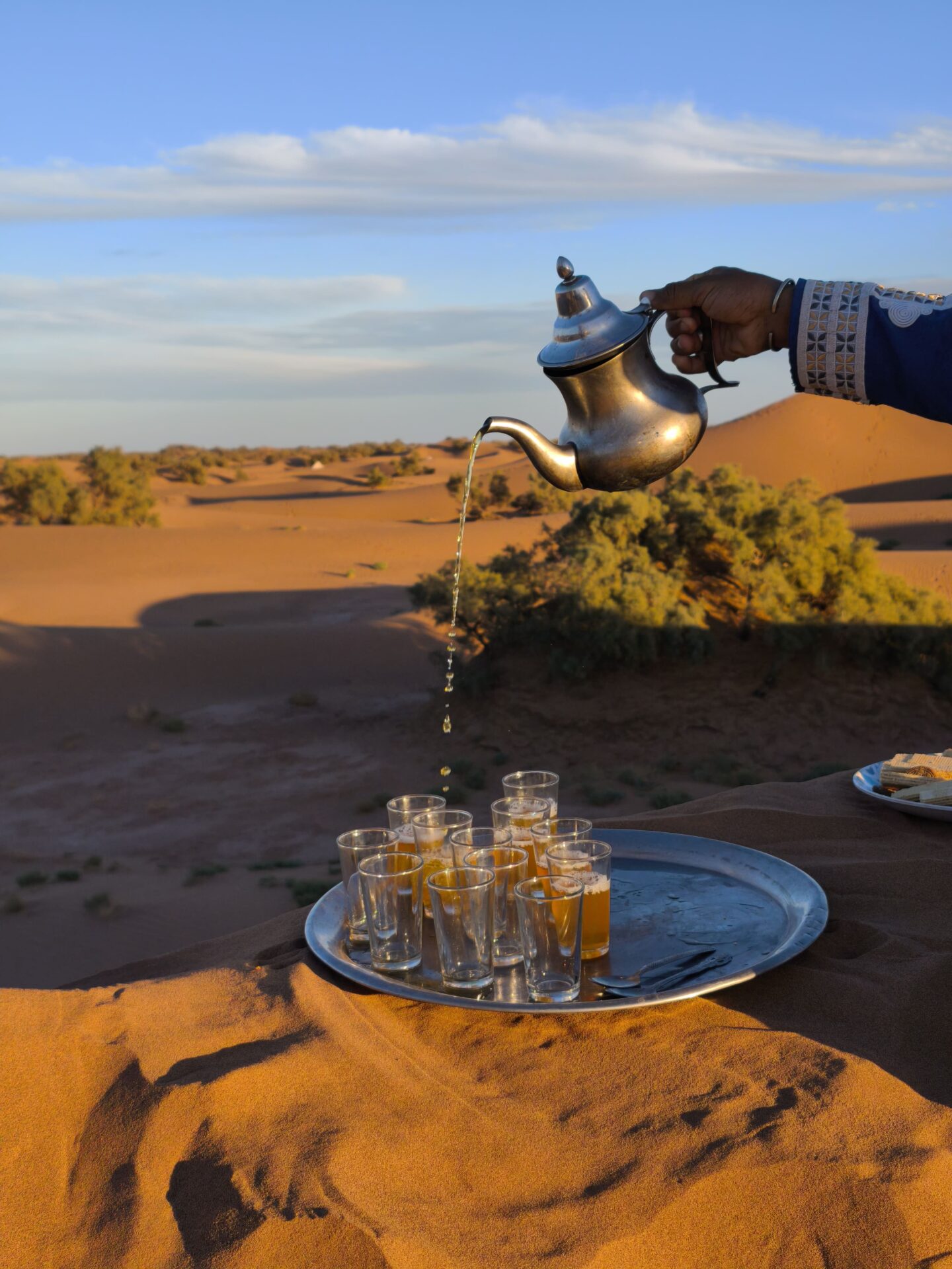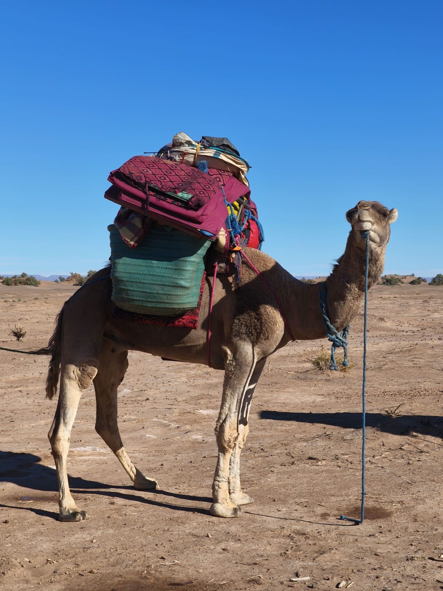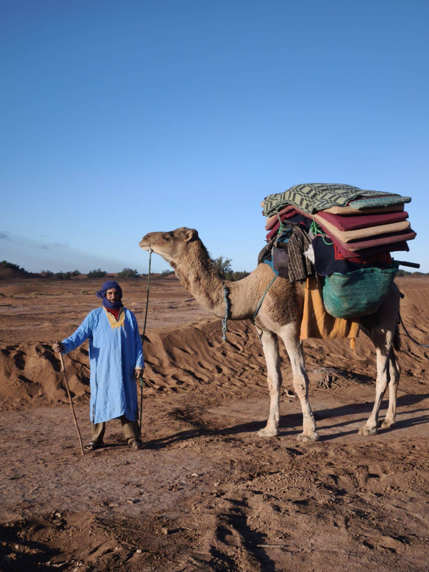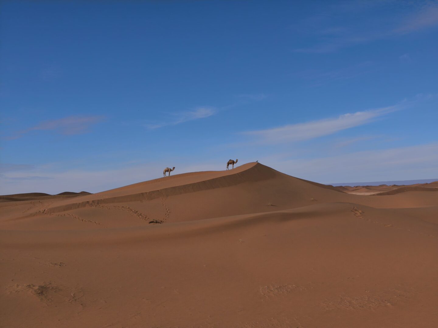 Chaque matin, le petit-déjeuner était servi aux alentours de 8h, toujours en haut d’une dune. Installés sur des tapis, nous partagions du pain des sables préparé la veille, accompagné de thé marocain encore chaud. Une fois le camp levé et les dromadaires chargés, nous partions pour plusieurs heures de marche à la découverte du désert. En moyenne, nous faisions 15km par jour.