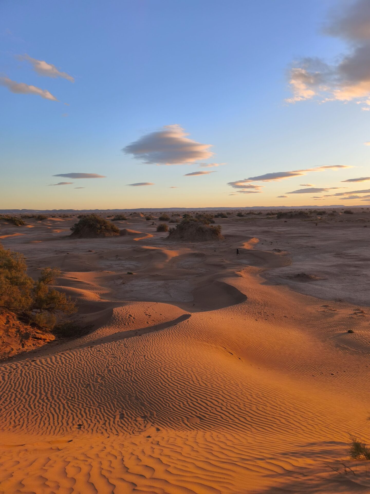 J’ai profondément aimé cette slow life, si différente de mon quotidien, mais aussi de mes nombreux treks en montagne. Ici, aucune pression liée à la marche. Le terrain est globalement plat, avec très peu de dénivelé, sauf lorsqu’il faut grimper au sommet des plus hautes dunes pour admirer l’immensité du désert et ses couchers de soleil à couper le souffle.